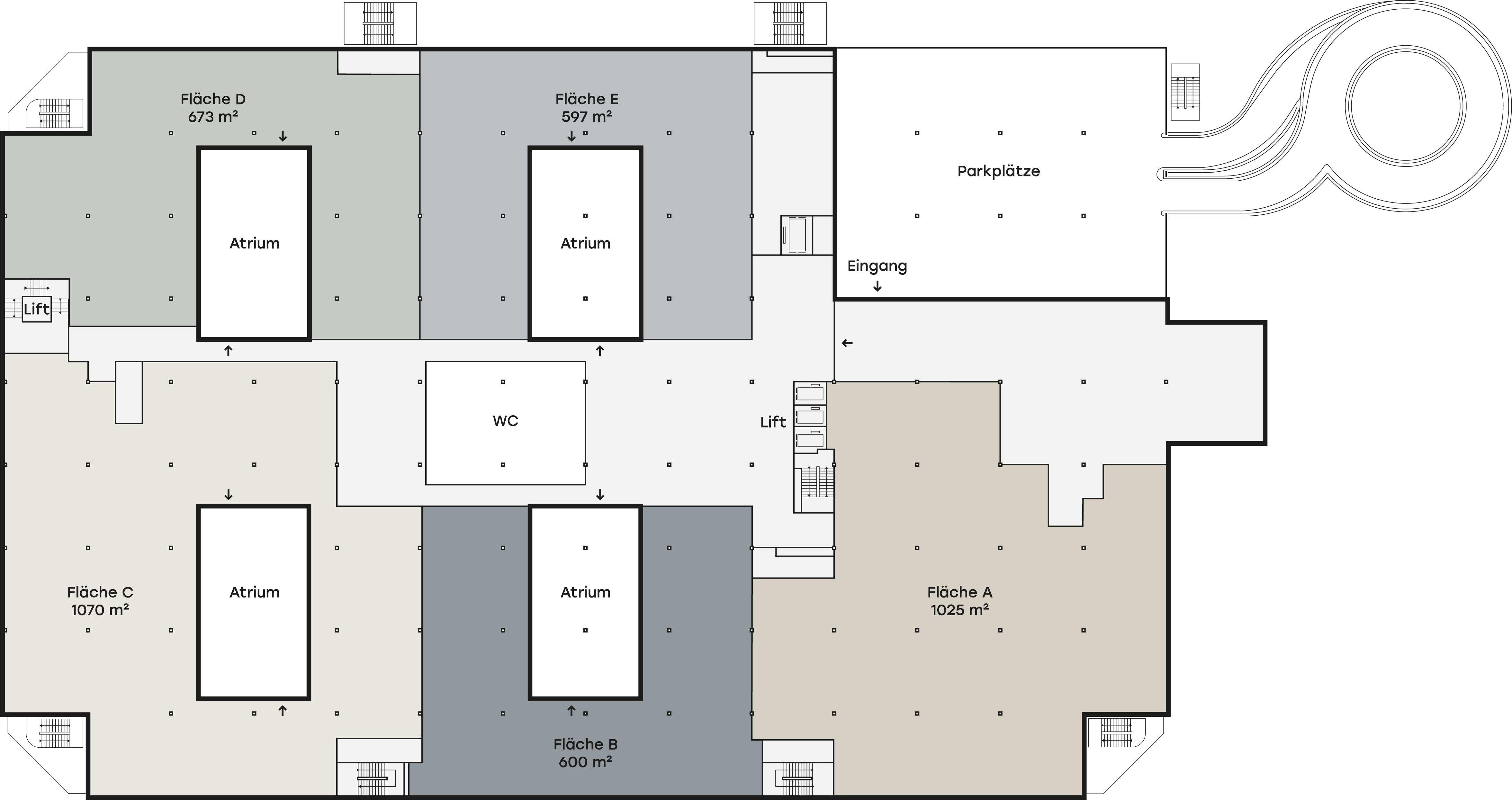 | Fläche E | 597 m2 | 2. Obergeschoss | 3.50 m | ab dem 01.01.2026 | Fr. 180.00/m2 | ||